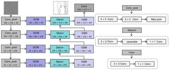 The proposed neural network is based on the U-Net network and has two functional modules, the GCM and GSM, which can finely describe faults of different scales. Its architecture is shown in Figure 6. Due to the powerful multi-scale information selection ability of GCM and GSM modules, this paper only uses a 4-layer U-Net based on a coding–decoding structure as the basic network. In the coding path, only two 3 × 3 convolution and maximum pooling are used to quickly obtain feature maps with different resolutions. In the decoding path, multiple simple decoding blocks are used to quickly and effectively recover feature maps with high resolution. In this neural network, the data distribution after convolution is corrected by BN and ReLU, and the GCM module is placed at the connection layer of the network to automatically select multi-scale information, which makes up for the lack of transmitting single information to the decoder by the encoder of conventional U-Net. At the same time, the GSM module between groups is placed in the path of decoder to realize the function of multi-scale information selection, which makes up for the disadvantage of losing global information in up-sampling process.