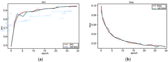 Figure 7 shows randomly seismic data sets with their corresponding labels. We used another 200 images as test and validation data, which were not included in the training. In the process of training, SGD is used to optimize the network, and the number of images sent into the network is 10 each time. The network model can be trained when the number of epochs reaches 30 times. Figure 8a shows the change of training accuracy and validation accuracy of the modified U-Net with the number of epochs. After 30 epochs, the accuracy rate tends to be above 0.9. Figure 8b shows the changes of training loss and validation loss of the modified U-Net with the number of epochs. After 30 epochs, the loss value tends to 0.01. After training, save the network parameters. In the process of training and validation, in order to increase the diversity of training data sets and make the trained neural network have better classification or recognition performance, data enhancement is used to improve the diversity of training data sets. The data enhancement operation mainly includes data reversal and rotation around the time axis.