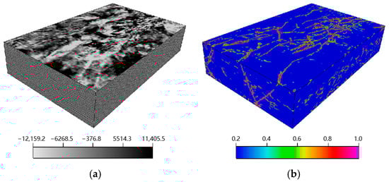 (a) Original 3D seismic data volume and (b) its fault probability volume.