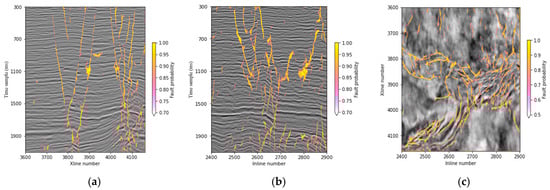 Three seismic images are displayed with faults that are imaged using the trained modified U-Net model. (a) Inline 2510; (b) Xline 4025; (c) a time slice at 1540 ms.