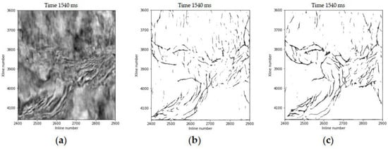 (a) A time slice is displayed with faults that are imaged via (b) the trained U-Net model and (c) the trained modified U-Net model.