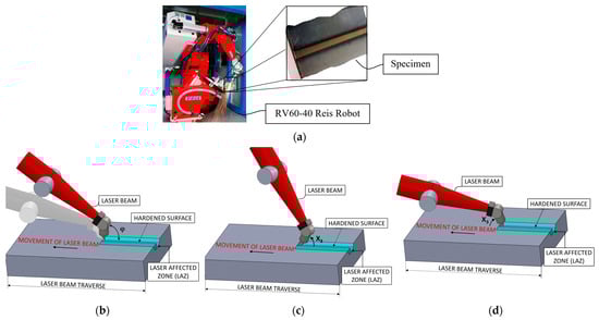 (a) RV60-40 robot and laser-hardened specimen. (b) Schematic view of the robot laser hardening process: (b) origin on the side of the hardened surface (impact angle φ, ranging from 0° to 180°); (c) horizontal component of the laser beam in agreement with the forward velocity of the laser beam (impact angles X3, ranging from 0° to 90°); (d) horizontal component of the laser beam in opposition to the forward velocity of the laser beam (impact angles X3, ranging from 0° to −90°).