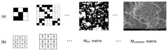 where m indicates the dimension of the Mkxk matrix containing all the k × k pixels in the SEM image; n is the number of the entire pixels forming the matrix; b indicates the number of black pixels in the considered matrix; and Dk is the parameter relative to the geometric complexity. Equations (2)–(4) illustrate the procedure described, which is also shown in Figure 4b.