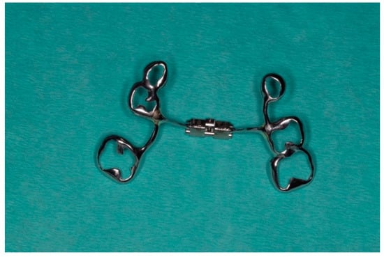 All patients were treated with rapid maxillary expanders. The orthodontic devices were fixed, with a central expansion screw, and support arms extended to the palatal surfaces of the deciduous canines. The appliance is presented in Figure 1. All patients were treated with the same activation protocol: two daily expansion activations (average number of total activations: 12.1 ± 1.4), until contact between the palatal cusps of the upper molars and the vestibular cups of the lower molars was achieved. The orthodontic device was removed approximately some months (6–8 months) after the first activation (T1).