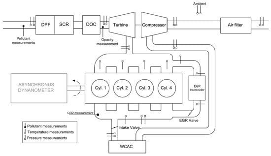 The engine layout and pressure, temperature, and polluting sensors installed in it are shown in Figure 1 The Acquisition frequency was always 1 Hz (as RDE regulation imposes) for all the pollutant emissions, dynamic variables, temperatures, pressures, and mass flows.