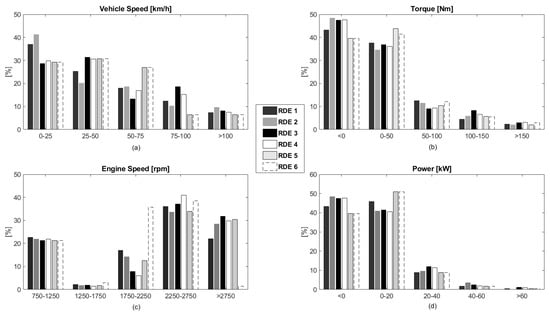 The analysis of cycles was performed by looking at the dynamic variables’ distribution [32]. In this analysis, the vehicle speed, torque, engine speed, and power were divided into five segments. Figure 5 shows the distribution frequency of these parameters for each RDE cycle.