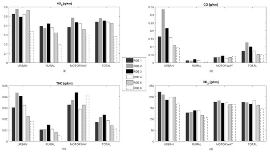 Figure 7 shows a significant dispersion between pollutant emissions. In the case of NOX emissions, leaving RDE 6 aside (the driver behavior was modified), the differences reached up to 17.39% in an urban zone, 30.88% in the rural zone, and 27.10% in the motorway. The total specific emissions showed the maximum difference of 12.74% between RDEs 2 and 5.