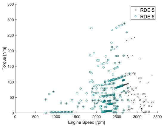 The required engine power to reach a certain vehicle speed in a cycle is obtained from the engine speed and torque. Since the engine speed was reduced in the case of the RDE 6 by varying the shifting procedure, the torque was increased. Figure 8 shows the effective engine torque as a function of engine speed for RDEs 5 and 6. RDE 6 dots are located closer to the top left corner (high torque and low engine speed).