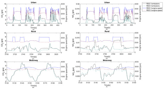 According to the driver behavior, in the case of RDE 5, the engine speed reached higher values while more loaded conditions were characteristic in RDE 6. Figure 9 shows three different fractions of RDE 5 and 6 cycles during urban, rural, and motorway driving, where the differences in CO2 and NOX emissions can be observed.