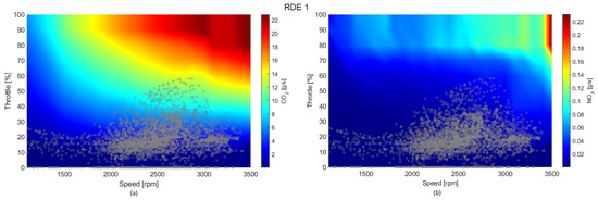 The CO2 and NOX emissions are represented in Figure 10. The operating area of RDE 1 is also represented by dots on the contour plots, which are devoted to CO2 and NOX emissions. As observed in Figure 10a, the maximum CO2 emission was located in the top right corner, whilst the minimum was at the bottom left one. However, Figure 10b shows how NOX emissions were mainly influenced by the EGR rate, which is different depending on the operative engine conditions although lower as the load and speed increased.