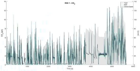 A comparative study of CO2 and NOX emissions obtained from the RDE tests and the steady-state results from the engine map was performed considering the engine speed and throttle during the cycles. Figure 11 and Figure 12 show the instantaneous CO2 and NOX emissions of RDE 1 versus the emissions obtained by interpolation in the engine maps.
