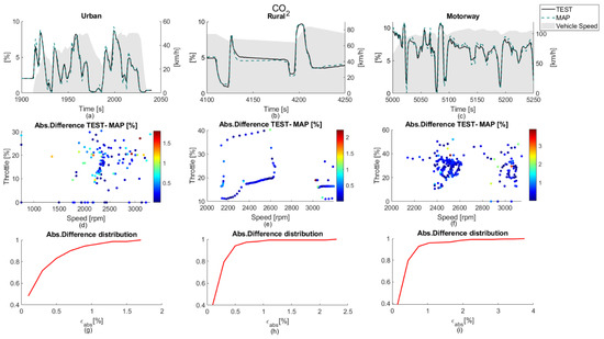 Making a deeper analysis, Figure 13a–c and Figure 14a–c show three fractions of 150 s of CO2 and NOX emissions in RDE 1 corresponding to urban, rural, and motorway driving phases, respectively. Absolutes differences between emission concentrations in dynamic and steady operation are presented in Figure 13d–f and Figure 14d–f. Finally, Figure 13g–i and Figure 14g–i represent the distribution of the emissions absolute error for these species.