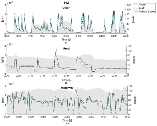 As previously commented, during the tests, it was not possible to measure the PM along the entire driving cycle. However, three different periods of 500 s corresponding to three zones (urban, rural, and motorway) in RDE 1 have been considered. Figure 15 shows RDE PM mass emissions compared to those obtained from the steady-state map.