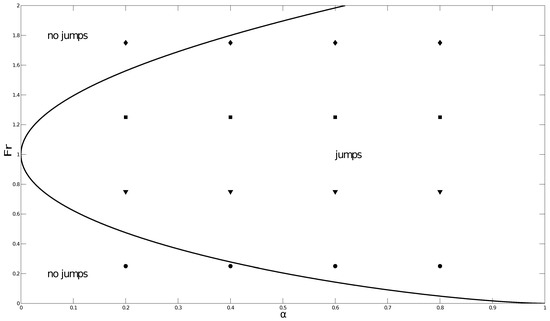 The phase diagram shown in Figure 1 had been first derived numerically in [4] and successively verified through experiments in other works, e.g., [20], for high Reynolds Number flows. Many different regimes have been found experimentally for two-layer flows [20,21,22,23,24,25], three-layer flows [19], or flows with a continuous density gradient [26].