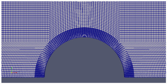 For the following simulations, we have imposed kg·m, Pa·s for the heavier fluid and kg·m Pa·s for the lighter fluid in order to have the same density and viscosity ratios as those of water and air. The domain considered is 50 times larger than the obstacle height H and 12 times higher. The details of the computational grid are shown in Figure 2.