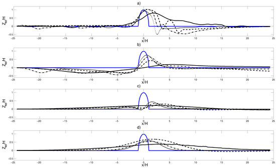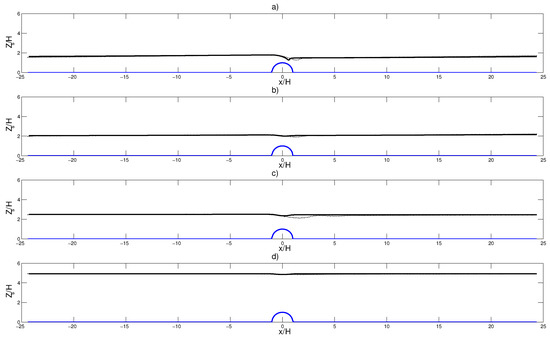 The shape of the apparent bottoms are displayed in Figure 9 for the 16 considered configurations. All these shapes are smoother than the actual semi-circular profile and exhibit a maximum located downstream the actual one. The apparent bottom solution clearly captures the main features of the free-surface, derived from the NS model, which are disregarded in the SW model close to the obstacle. In particular, the obtained apparent bottom roughly incorporates both the actual obstacle and the complex flow cells induced by its presence. FromEquation (28), we can see that the slope of the apparent bottom is proportional to the slope of the free-surface. Since for this combination of Froude numbers and blocking factors the free surface profile is wavy, in agreement with [53,54,55,56], this explains the apparent bottom pattern in Figure 8a–c. The concept of apparent bottom seems, however, more intuitive for the case since regular bumpy shapes are observed in Figure 8d.