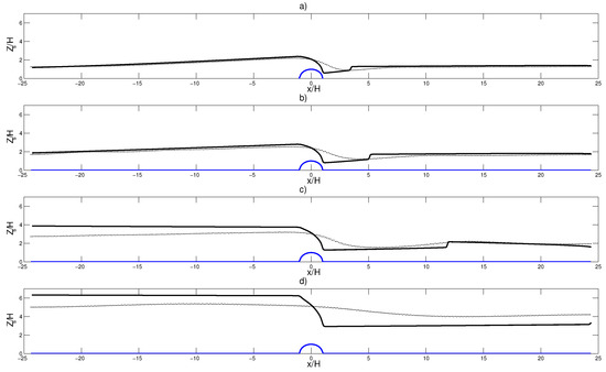 The last case, depicted in Figure 5d is different, the motion is completely super-critical and no hydraulic jump is observed. The free-surface is parallel to the bottom upstream and downstream and follows the obstacle shape showing the maximum height at the top of the obstacle. This is in agreement with the theoretical critical curve displayed in Figure 1, in which we can see that for and there are no hydraulic jumps. The NS model results are similar to those obtained for in terms of at least. The free-surface profile has the typical super-critical shape, but looking at Figure 6d, we realize that the results deviate significantly from the SWM.