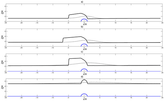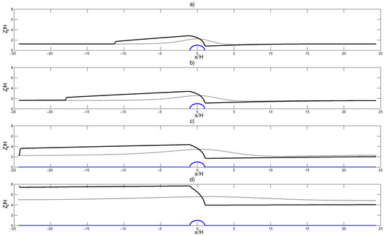 In Figure 5, the case of is analyzed. In this case, we still have a hydraulic jump in the SWM. The difference from the previous case is that, here, the hydraulic jump is located upstream the obstacle. For this case the SWM gives a typical trans-critical curve, with a sub-critical flow upstream the obstacle and a super-critical flow downstream. In the transient period, a bore is departed from the obstacle upstream, but in this case, at a certain distance from the weir, which grows with decreasing , the bore stops as observed in [4,57]. In Figure 5d, this is not visible because the domain is probably not long enough and the bore can get out. The results of the NSM are very different. In fact, for all the blocking factors, the profile has the typical shape of the super-critical case, and no jump is observed. The free-surface follows the bottom profile and, approaching the obstacle, it rises rather than falling, while moving away from the obstacle it falls instead of rising unlike in the sub-critical case.