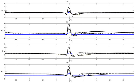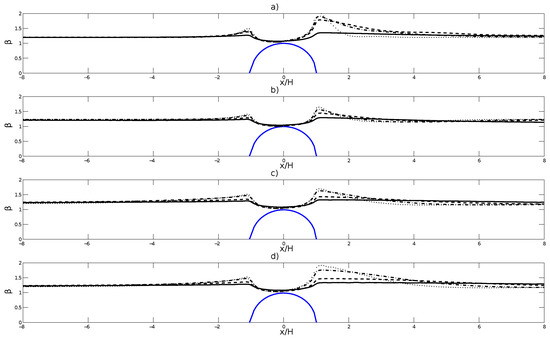 In Figure 8, the pattern of is shown. As for , far upstream and downstream the obstacle, the equilibrium value, is reached. The non-dimensional dissipation parameter has, for all the considered cases, the following shape: it approaches 1 for , has two minima at the beginning and end points of the obstacle and a maximum slightly upstream the top of the obstacle.