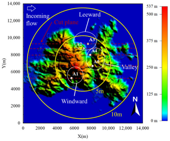 The topography investigated herein is an island located in the coastal region of South China. A view of this region is shown in Figure 1 along with the measurement locations for this study. For the wind tunnel test, wind speeds were measured at a total of five locations on the island, which are potential wind power sites. The center region of the island has the highest elevation with a mountain running northwest to southeast. There is a valley to the east of the mountain with another mountain stretching from the northeast to the southwest to the east of the valley. Overall, the topography of the island can be characterized as high-west and low-east. According to the topographic features of the island and the incoming flow direction, measurement locations were divided into three regions: windward region, leeward region, and valley region. As shown in Figure 1, location A1 was situated in the windward region, which is the windward slope of the center mountain, while locations A2 and A3 were situated at the leeward slope. The valley region representing the valley terrain at the island center included measurement locations of A4 and A5.