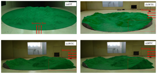 The test model at wind tunnel: (a) OT; (b) WTS; (c) WTC; (d) RTC.