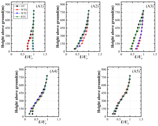 Figure 4 shows the normalized velocity profiles of location A1, where obvious differences in the four test cases are found near the ground. The influenced area is approximately 450 m above the ground in true magnitude, in which the profiles of WTC and RTC are higher than the other two. Because A1 sits at the windward of the center mountain near the edge of the terrain model, the speed-up effects generated by transition sections control this area. For OT and WTS, the mean velocity profiles are similar under a height of approximately 400 m. However, it should be noted that the flow behaviors in these two cases are completely different. In case OT, there is a side mountain range running northeast to southwest at the front of location A1. As shown in Figure 5, the mountain peak lies ahead of location A1 with a height of approximately 400 m, leading to a blockage effect and flow separation. Hence, the mean velocity profile in the OT case shows a smaller speed at the part below approximately 400 m. In addition, for the case WTS, the front mountain peak was truncated and created an “artificial cliff” with a height of 287 m. Owing to the larger height difference between the terrain model edge and the wind tunnel floor, separation bubbles occurred, and flow separation controlled this region. However, this does not mean that the WTS shows better performance than the WTC and RTC. It is just a special case with a mountain peak at the front of location A1. Moreover, both the WTC and RTC could accelerate the flow near the ground. When the transition section is implemented, the speed-up effect should be considered, which may considerably affect the experimental accuracy, especially for the locations close to the terrain model leading edge.