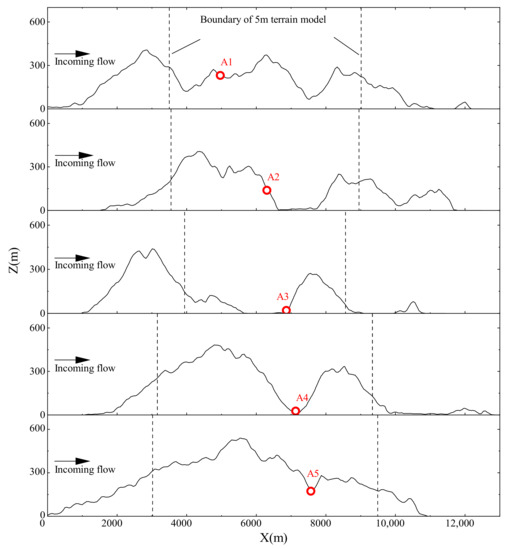 The velocity profiles at the valley region, including the measurement locations of A4 and A5 at the bottom of the valley, show virtually no distinction because these locations are considerably affected by recirculation flow in the enveloping separation bubble. The cutting planes of these two locations are shown in Figure 5. From the cutting planes, when the terrain model has been truncated, most topography features at the front of measurement locations are retained, particularly the mountain ridge. Thus, there are few differences in the velocity profiles.