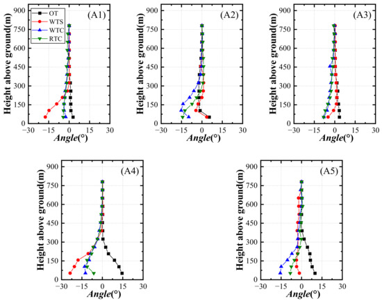 At A2 and A3 in the leeward region, the profiles of the inclination angle in cases with transition sections are quite different from OT with a negative value. Although the profiles of WTS are not the same as those of OT, they are numerically closer, which indicates that when better velocity profile results are obtained, the additional inclination angle induced by the transition section cannot be ignored.