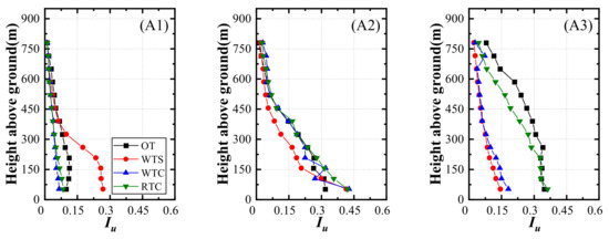 Turbulence intensity is given by the standard deviation of streamwise wind velocity normalized by mean velocity. The turbulence intensity profiles of the measurement locations, shown in Figure 7, intensely change in the region near the ground. Location A1 in the windward region shows higher turbulence intensities at the lower part of the profile for WTS, which indicates that flow separation induced by topographic truncation enhanced turbulence production in the region near the model edge to a greater extent, leading to inaccurate experimental results. Combined with the analysis of the mean velocity in Section 3.1, the study noted that flow separation in the case of WTS generated a similar profile in mean velocity but a different profile in turbulence intensity with OT. This means that flow separation induced by terrain truncation at the region near the terrain model edge is a difficult issue in turbulence simulation. Moreover, the lower level of turbulence intensity in cases with transition sections indicates that implementing transition sections in the experiment can effectively avoid flow separation, but there is no avoidance of the speed-up effects.