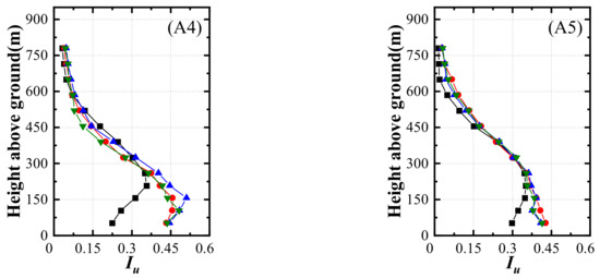 In the valley region, there are two measurement locations: A4 and A5. Due to the influence of flow separation in the previous analysis of mean velocity, the profiles are almost unchanged in different cases. However, it is entirely diverse in profiles of inclination angle. The inclination angle profiles in the cases of WTS, WTC, and RTC are almost opposite that of OT at heights below approximately 450 m for locations A4 and A5. Positive values have been observed in the region near the ground in the case of OT, while negative values have been found in the other cases. As shown in Figure 6, there is only a single peak ahead of locations A4 and A5. According to previous studies, flow separation off a peak or the edge of a bluff body creates a detached shear layer whose character depends strongly on the separation location [36]. For the single peak topography, separation occurs over crests and on the windward face, while the upwind topography of multiple peaks may advance the separation location. Thus, when the terrain model has been truncated, the single peak topography may be changed to multiple peaks by “artificial cliff”, and locations of the valley region show opposite inclination angles with OT. For this reason, the values of the inclination angle at locations A4 and A5 become negative in the cases with the truncated terrain model. Additionally, the differences in the cases of WTS, WTC, and RTC indicate that the separation location is determined not only by the slope of the peak but also by its geometry.
