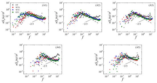 Normalized streamwise spectra for measurement locations at a height of 104 m: (A1) location A1; (A2) location A2; (A3) location A3; (A4) location A4; (A5) location A5.