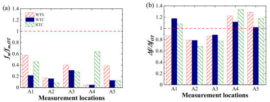 As illustrated in Figure 10, fm,OT and ΔfOT mean median of normalized frequency and bandwidth of normalized frequency in the case of OT, respectively. As seen in Figure 10a, the normalized median of all cases and measurement locations shows values lower than 1. This indicates that the spectra obtained from the truncation terrain model show a higher value than that from OT, which also supports our analysis in Sect. 4.2. In addition, it can be concluded that energy shifts to a low-frequency range when using the truncation terrain model to obtain spectra.