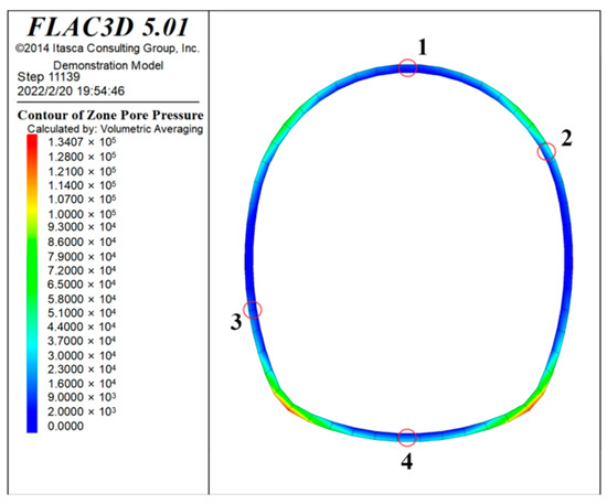 Table 1 that under the condition of water blocking and drainage restriction, the external water pressure distribution of the initial support is uneven, and the maximum water pressure is 134 kPa. The total head at the vault of the tunnel is 52 m, and the water pressure at each part is less than 30% of the total head. It shows that the water pressure outside the tunnel lining is not hydrostatic pressure. The water pressure is different at different positions. The water pressures of monitoring points 1–4 are 11.53, 12.66, 18.74, and 31.54 kPa, respectively.