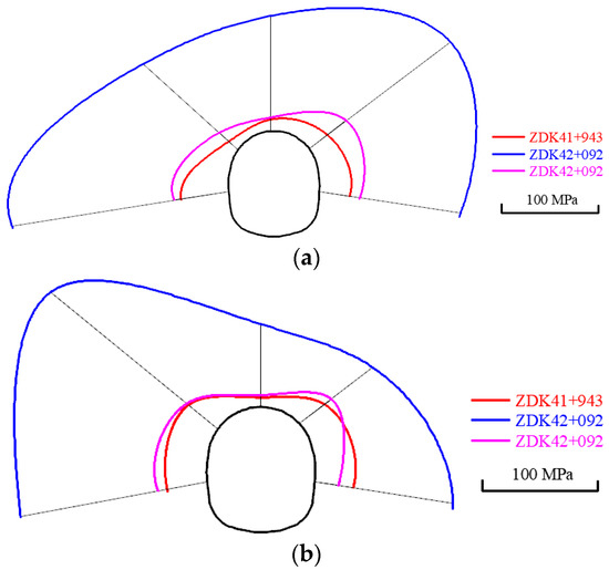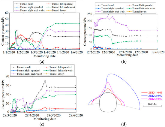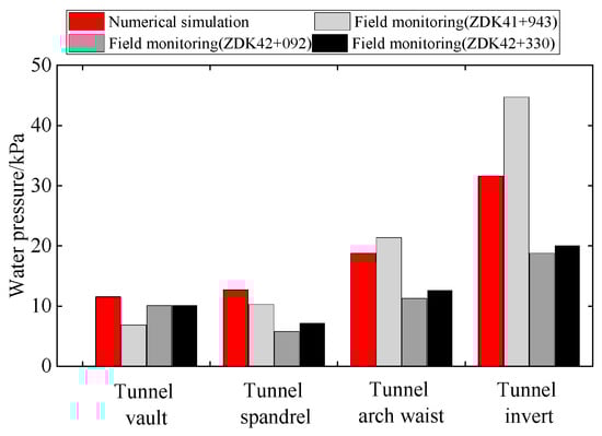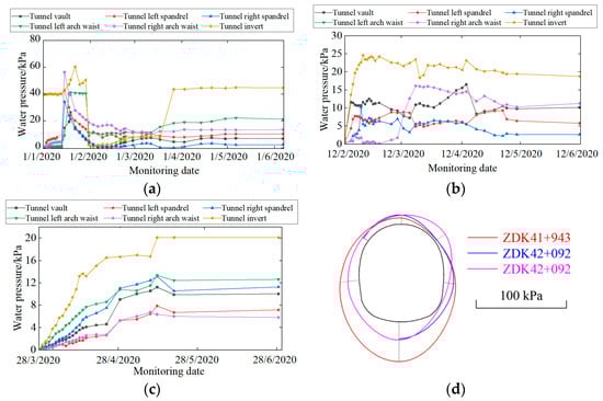 Figure 5 that the external water pressure of the initial support of ZDK42+330 quickly is located in an F5 fracture zone. There was strong volatility in the early stage, although the external water pressure on the initial support of the two sections gradually stabilized after more than two months. ZDK41+943 and ZDK42+092 are located in the F5 bedrock fracture zone, although the two sections finally reach a stable state. However, there was strong volatility in the early stage, which gradually stabilized after two months. On the 14th day of monitoring, the external water pressure of the initial support of ZDK41+943 increased as a whole. The maximum value appears in the inverted arch, reaching 61 kPa, about 11% of the total head. After the water pressure of each part is maintained for about 1 week, it gradually drops to the normal level. Combined with the on-site construction, it is found that the reason is the poor drainage in this area. After the external water pressure of the lining is stable, the water pressure at the inverted arch is the largest. The water pressure at the tunnel invert for ZDK 41+943 and ZDK 42+092 is about twice the one at the other parts of the tunnel. The initial support water pressure of the three monitoring sections finally stabilized below 50 kPa, which is equivalent to the hydrostatic pressure generated by a 5 m water head. The total water head at the vault of the three sections of the tunnel is between 51 m and 55 m. It can be seen that the external water pressure of the initial support measured on site is less than 10% of the total water head.