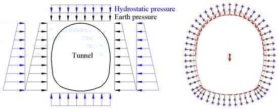 Table 8, in which the actual water pressure shall be reduced according to the working conditions. The surrounding rock load distribution and the calculation model are shown in