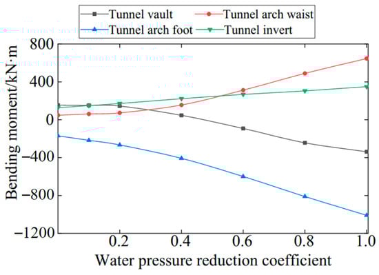 Figure 9, the bending moment of all parts except the vault increases with the increase of the water pressure reduction coefficient. Among them, the growth rate of the arch foot and arch waist increases gradually, and the growth rate of the inverted arch decreases gradually. With the increase of reduction coefficient, the lining structure at the vault is transformed from inner tension to outer tension, and then the bending moment increases gradually. When the reduction coefficient increases from 0 to 1, the bending moment at the vault changes from 154.4 kN·m to −338.2 kN·m. The arch waist increased from 47.7 kN·m to 646.8 kN·m, increasing 12.6 times. The arch foot increased from −169.5 kN·m to −1009.9 kN·m, increasing about 5 times. The inverted arch increased from 128.3 kN·m to 349.3 kN·m, increasing 1.7 times. It can be seen that the change of reduction coefficient has the greatest impact on the bending moment at the arch waist, followed by the arch foot. Under the same reduction coefficient, the bending moment at the arch foot may be significantly greater than that at other parts.