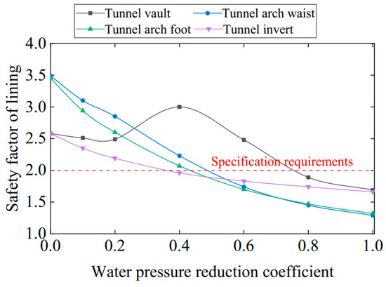 Figure 11 that under the existing reinforcement scheme, with the increase of reduction coefficient, except for the temporary increase at the vault, the safety coefficient at other parts gradually decreases, and the decline rate gradually decreases. The overall safety of the lining is controlled from the inverted arch to the arch waist. Although the internal force of the arch foot is significantly greater than that of other parts, due to the strengthening of this part, the overall safety is not controlled by the arch foot. When the reduction factor is less than 0.4, the existing scheme can meet the structural safety factor’s requirement to be greater than 2. The reduction coefficient increases from 0 to 1, and the safety factor at the vault decreases from 2.58 to 1.69. The safety factor at the arch waist is reduced from 3.49 to 1.29, the safety factor at the arch foot is reduced from 3.45 to 1.32, the safety factor at the inverted arch is reduced from 2.58 to 1.66, and the overall safety factor of the lining is reduced from 2.58 to 1.29. It can be seen that if the selected water reduction coefficient is smaller than the value that should be selected, the safety coefficient of the lining may be higher than the actual situation, which is contrary to safety.