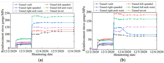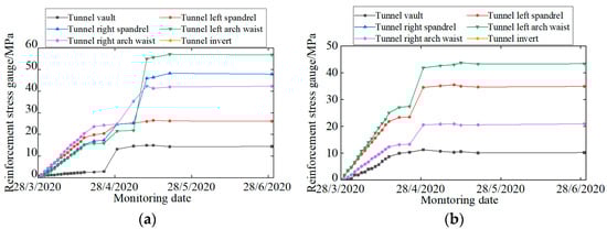 23]. The total head height of the tunnel vault is 51–55 m. Pre-grouting water blocking measures are taken for all three sections. The statistics of the monitoring sections are shown in