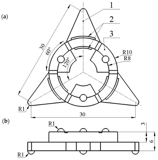 Figure 1). The passive layer consists of three trapezoidal cantilevers joined in the center of the structure. Piezoceramic ring is made from hard type ceramic PIC181 (PI Ceramics, Lederhose, Germany). The top electrode of the piezo ceramic ring is divided into six equal segments that are used to control planar and angular motions. The ring is in contact with the passive layer only at the bases of trapezoidal cantilevers, while the other three segments of the piezo ceramic ring are free from the passive layer. In addition, each trapezoidal cantilever has cuts near the piezo ceramic ring that were made to reduce the vibrations coupling between different segments of the piezo ceramic ring and trapezoidal cantilever. Alumina oxide semispherical contacts are glued at the end of each trapezoidal cantilever and are in contact with the plane used for the planar locomotion of the robot. Three additional semispherical contacts are placed on the top of the ring and are used to place the payload on the robot and rotate it. Vibrations of the particular contact are excited by the corresponding section of the piezoceramic ring.
