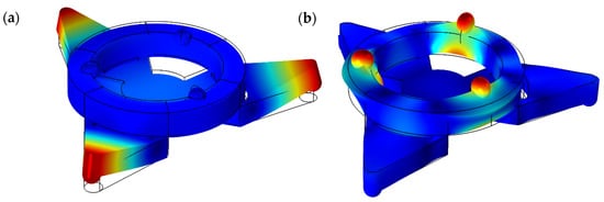 Firstly, a modal analysis of the robot was performed. The goal of the study was to indicate vibration modes and natural frequencies suitable for robot operation. The electrical boundary condition of the piezoceramic ring was set to obtain a short circuit status. Modal shapes of the actuator are shown in