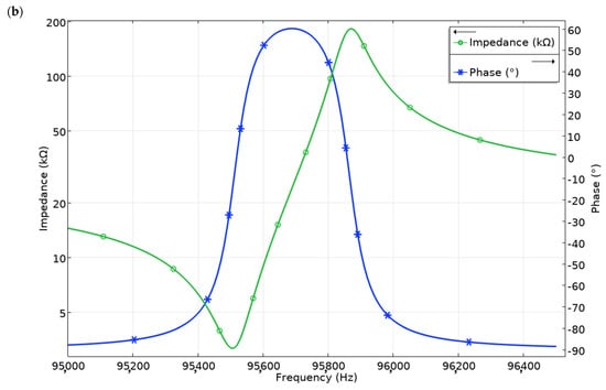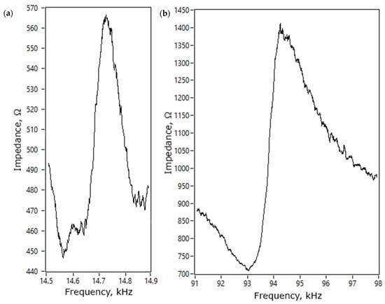 Figure 14. Resonance frequencies of the first bending mode of the trapezoidal cantilever and the third radial mode of the piezo ceramic ring were obtained at the frequencies of 14.55 kHz and 93.15 kHz, respectively. The differences between calculated and measured resonance frequencies are 1.44 kHz or 5.1% for the first bending mode and 2.36 kHz or 2.47% for the radial mode. Mismatch of the resonant frequencies comes because of the calculation errors, differences in boundary conditions during calculations and measurements, and slight differences in material characteristics. On the other hand, differences do not exceed 5%. Effective coupling factor