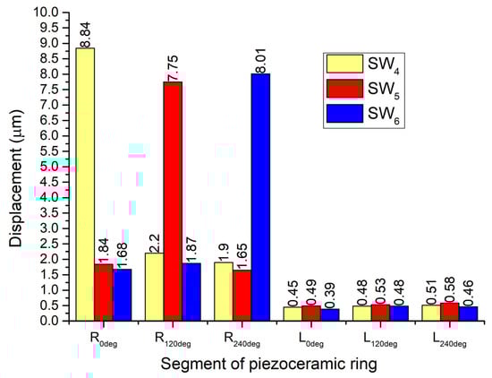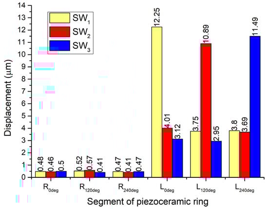 Peaks of displacement amplitudes occur at the frequency of 95.51 kHz. This confirms the results of modal analysis and impedance–frequency characteristics. The minor difference in resonant frequencies was obtained due to different electrical boundary conditions. The displacement amplitude generated by segment R0deg has a value of 8.84 μm or 176.8 nm/Vp-p, while displacement amplitudes of passive segments R120deg and R240deg reached 2.2 μm. The average vibrations coupling ratio between these segments is 4.01. It must be noted that segments L0deg–L240deg vibrate as well; however, the amplitudes of vibrations are much smaller.