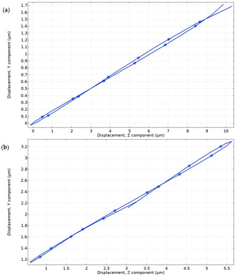 Figure 12a shows the displacement trajectory of the contact point located at the end of the trapezoidal cantilever driven by segment L