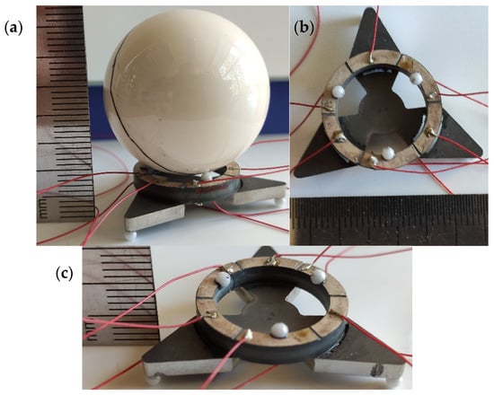 The rotational motion of the payload around the X or Y axis is obtained in a similar way, i.e., by applying a harmonic signal with a frequency of the third radial mode of the piezoceramic ring to segment R0deg, R120deg, or R240deg. Radial vibrations of the segment make impacts to the spherical surface of the payload, and angular motion of the payload is generated. Reverse motion is obtained when the same harmonic signal is applied to two opposite ring segments. Moreover, to obtain rotation around the Z-axis, three harmonic signals with a phase difference of 120° should be applied to all segments R0deg, R120deg, or R240deg.