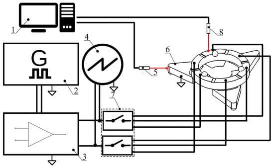 Figure 15). The experimental setup included a computer, a function generator WW5064 (Tabor Electronics, Nesher, Israel), a power amplifier PD200X4 (Piezo Drive, Shortland, Australia), oscilloscope DL2000 (Yokogawa, Tokyo, Japan), a displacement sensor ILD 2300 (Micro-Epsilon, Ortenburg, Germany), tachometer DT210 (Nidec-Shimpo, Tokyo, Japan) and self-made switch boxes.