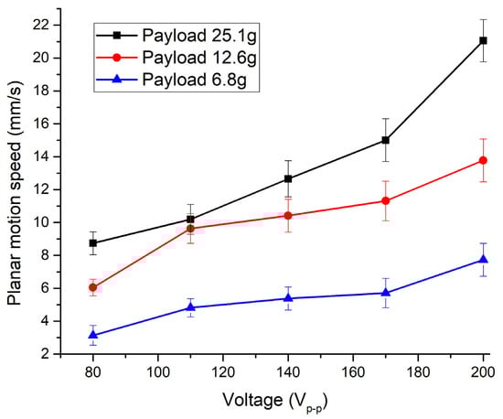 Figure 16. It can be seen that the lowest planar motion speed was obtained while excitation signal amplitude and payload were 80 V