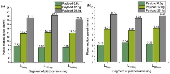 The highest planar speeds generated by different piezoceramic segments have different values that depend on the payload applied to the robot. Fluctuations of speeds values, while payloads of 6.8 g, 12.6 g, and 25.1 g are applied, are around 9.58%, 2.82%, and 8.96%, respectively. Therefore, it can be found that the lowest planar speed fluctuations are obtained while a payload of 12.6 g is used. It can be assumed that a payload of 12.6 g will ensure the most even planar motion speed in different directions. On the other hand, the lowest planar speeds have significantly lower values when different payloads are applied. The difference is more than 50% compared to the highest ones. However, the difference between the lowest values also depends on payload, with values of 11.58%, 5.37%, and 8.13% while 6.8 g, 12.6 g, and 25.1 g payloads are applied, respectively. Therefore, it can be found that the most suitable payload is 12.6 g. On the other hand, planar motion speed achieved at this payload is lower by 36.41% compared to planar speed obtained while 25.1 g payload was applied.