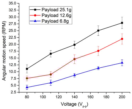 p-p. At the same excitation signal amplitude and payloads of 6.8 g and 12.6 g, angular motion speed reached 13.26 RPM or 0.066 RPM/V
