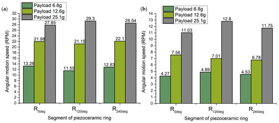 Figure 19. It can be seen that the highest angular motion speed was obtained when the payload of 25.1 g was applied. Angular motion speeds at this payload have a difference of 4.94%. On the other hand, at payloads of 6.8 g and 12.6 g, differences of angular speeds in different directions are 12.89% and 4.29%, respectively. Therefore, the lowest difference of angular speed values was obtained when the payload of 12.6 g was used.