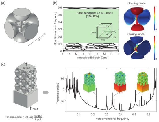 - D’Alessandro, L.; Belloni, E.; Ardito, R.; Corigliano, A.; Braghin, F. Modeling and experimental verification of an ultra-wide bandgap in 3D phononic crystal. Appl. Phys. Lett. 2016, 109, 221907. [Google Scholar] [CrossRef] [Green Version]